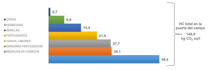 Según el discriminado que hace la entidad, de acuerdo a diferentes conceptos (Ver Gráfico), entre los rubros que más emiten están los residuos de cosecha, las emisiones por fertilización y también las labores (gasoil).